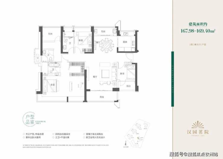 项目户型方正、布局合理,动静分区,其中168㎡五房户型为四阳台设计,客餐厅南北通透双阳台,豪华主卧大套房。