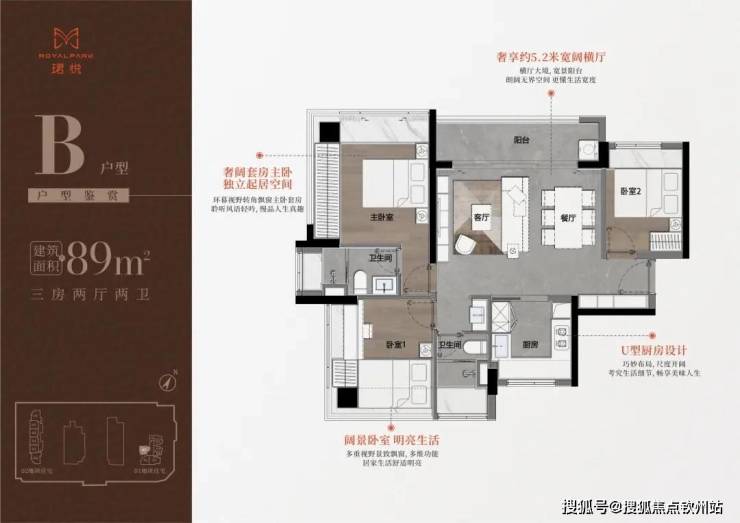 89㎡的3房2厅2卫,B户型(1栋1单元07户型),设计的是横厅南北通透格局,进门入户玄关,客餐厅5.2米开间,LDKB一体化,S墙设计预留冰箱卡槽位,三开间朝南,主卧+1个次卧双面大飘窗,客餐厅出5.2米宽景阳台,U型厨房,公卫三段式分离,得房率76.77%(不含赠送),套内面积68.95㎡,阳台主朝西北向。