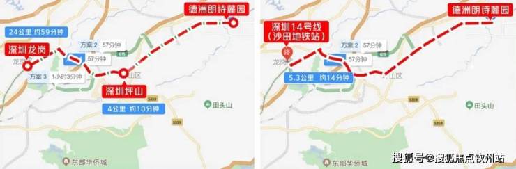 与坪山距离4公里开车仅需10分钟,与龙岗距离24公里,开车到深圳地铁14号线-沙田站,仅需14分钟。