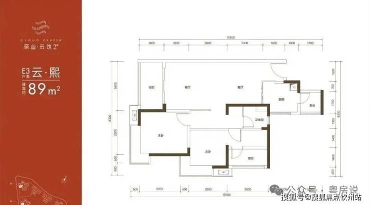 89㎡的3房2厅1卫,E2户型,设计的是竖厅格局,客厅3.6米开间,LDKB一体化设计,3个卧室分别做到了主卧13.5㎡/次卧9.54㎡/次卧8.1㎡(含墙体飘窗),L型厨房还带1个小生活阳台,卫生间三段式分离,得房率:79.89%(不含赠送),东南/西南或正南朝向。