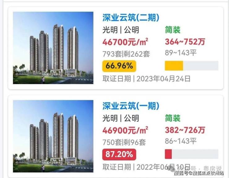 光明公明,深业云筑二期于2023年4月24日取证入市,推出4栋/5栋1/2单元/6栋/7栋,共793套房源,面积有89㎡的3房1卫,112-128㎡的4房2卫,143㎡的5房2卫户型,备案单价4.06万-5.29万/㎡,备案均价4.66万/㎡,总价364-753万/套,在2023年12月底已经交房,目前是现房销售,简装交付。