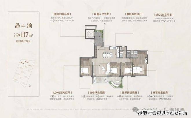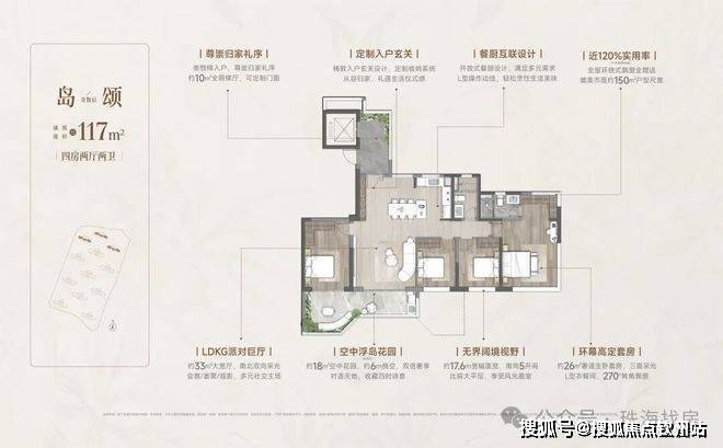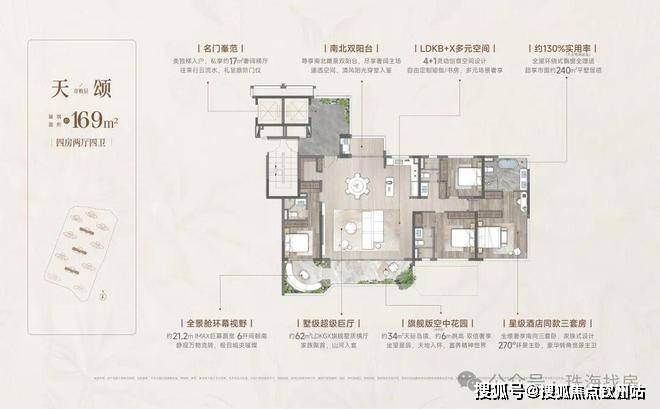 四代洋房·奢享写意人生 | 双入户大堂、一梯一户,稀缺至高约130%实用率(不含电梯厅),6面朝南,270°环幕采光,定制约6m错层空中浮岛,奢享墅质生活