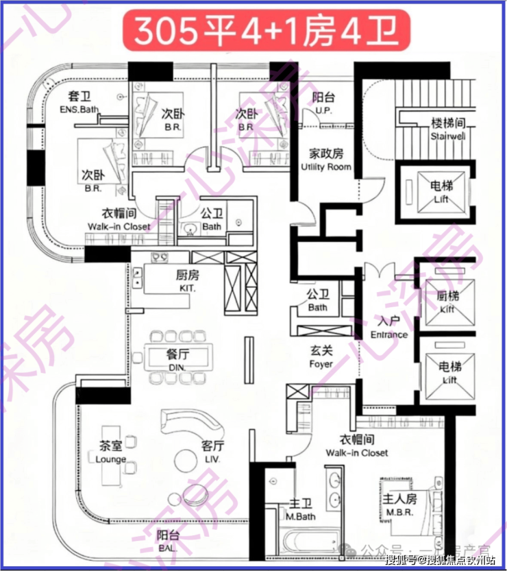 1D栋(1栋四单元)-45层:均为3梯2户,约305㎡,一层两户。