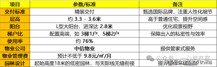 项目采用精装交付,层高在3.3米至3.6米之间。物业费预计不低于9.8元/㎡/月,由中信物业提供管家式服务,整体规划为涵盖住宅、商业、酒店、办公等业态的大型综合体,总建筑面积约31.64万平方米。小区采用空中花园设计,住宅起始高度约18米,以优化视野和私密性。