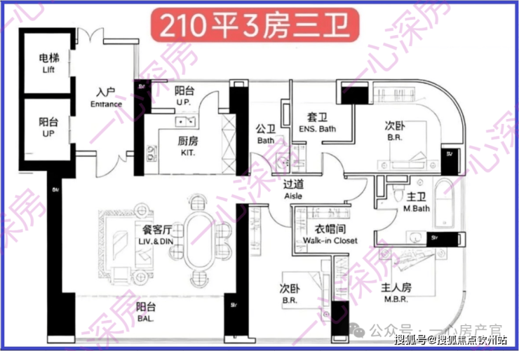 3、210㎡,有两户不好: 只有西南户是最好的,其他两户都不行,东南户虽说高层看海景,但是北侧的中厨、客卫、书房、次卧全部朝北对着墙面,并且飘窗为了和北侧在一水平面上,也做成了L型的直角。北侧的210户型,海景看到的景观面就不多了,但是给了两部电梯。