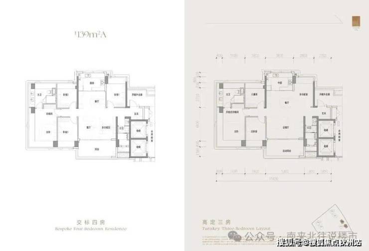 139㎡四房两厅两卫:位于3栋,提供A(竖厅南北通透)、B(双龙抱珠)两种格局。四开间朝南设计,主卧配备270°无柱转角飘窗。由SCD团队打造,提供“风尚米”和“经典灰”两种装修风格,可定制为高配版三房。