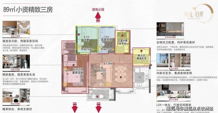 南光泊岸花园位于斗门西部中心城A片区平华大道南侧、湖心路西侧,南光泊岸总占地约3.5万㎡,总建面约8.3万㎡,容积率仅1.7,绿化率35%,共13栋小高层,其中1-5栋是18层,两梯五户设计,两户为建面75㎡三房两厅一卫,三户为建面89㎡三房两厅两卫;6-11栋是11层高,一梯两户板楼设计,均为建面99㎡四房两厅两卫设计,南北通透。