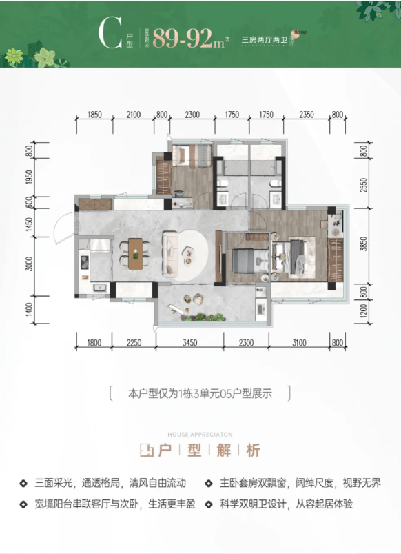 (2)89-92㎡三房两卫:分竖厅和横厅,全凸窗设计,竖厅可观会展河景;