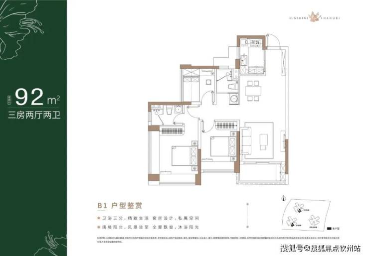 92㎡的3房2厅2卫,设计的是经典竖厅格局,客厅实测3.25米开间,LDKB一体化设计,三开间朝南,3个卧室分别做到主卧15.32m²/次卧9.15m²/次卧5.57m²(实测面积),主卧270°转角飘窗,L型厨房,公卫三段式分离,得房率:76.44%(不含赠送),西南或东南朝向。