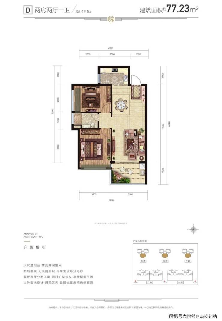 2、D户型面积:建筑约77㎡2房2厅1卫