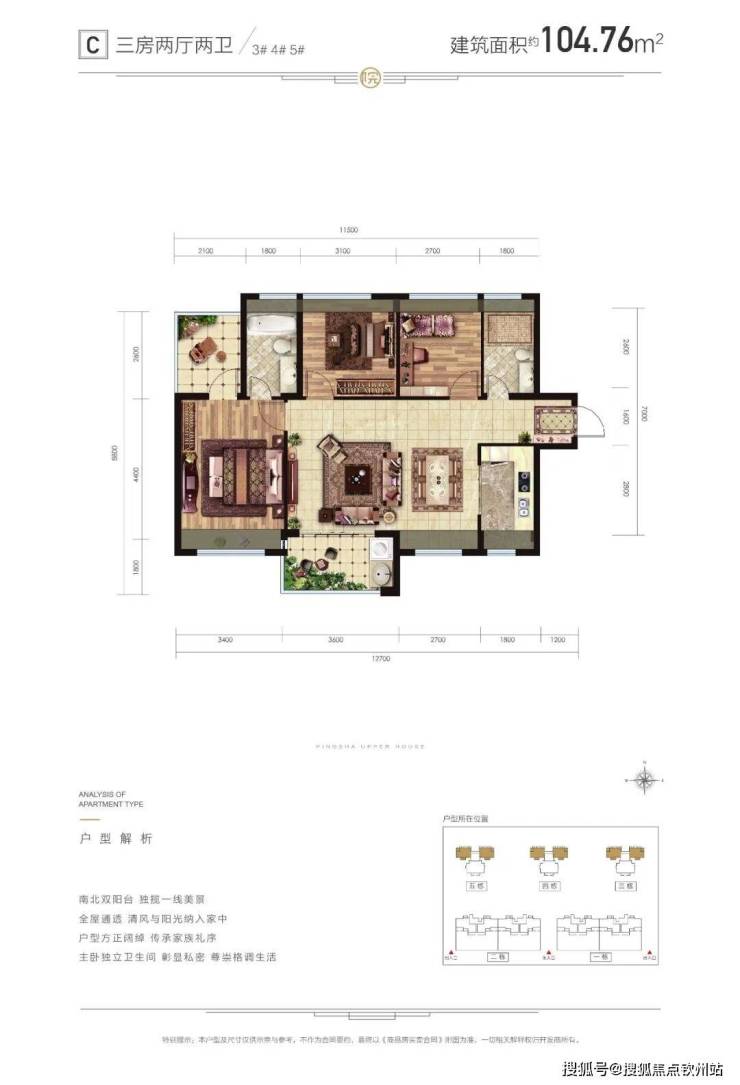 4、C户型面积:建筑约104㎡3房2厅2卫