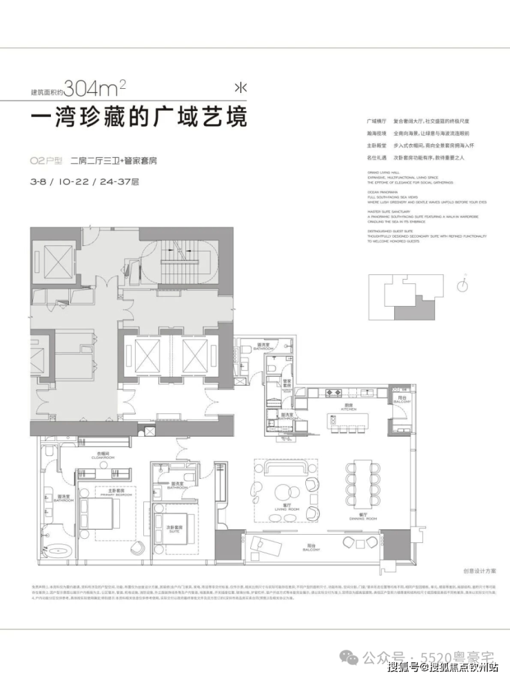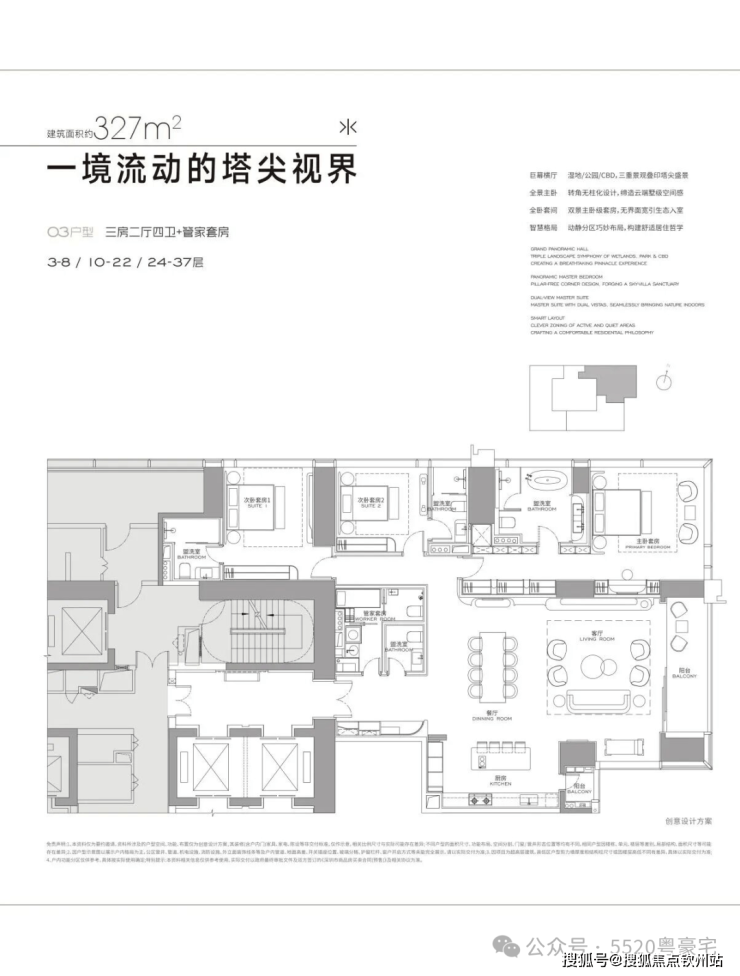 公寓主力户型为304㎡、327㎡、402㎡、570㎡以及1032㎡,公寓层高3.6米,低区5T3,高区5T2。