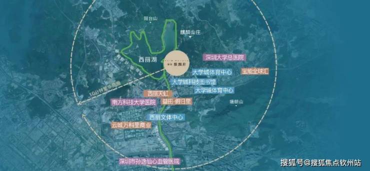 项目位于西丽度假村,旅游休闲资源丰富,主打生态景观。高层西北侧可眺望西丽湖,东南侧被深圳野生动物园(有消息称动物园原址规划为高校用地,或搬去坪山)和西丽高尔夫俱乐部环抱,远看塘朗山公园。