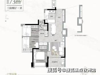 73㎡三房一卫:得房率 79.63%,竖厅格局,LDKB 一体化,S 墙设计预留冰箱位,U 型厨房,卫生间三段式分离。