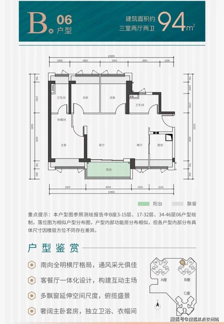 A座01户型、B座06户型:建面约94平方米,三房两厅两卫