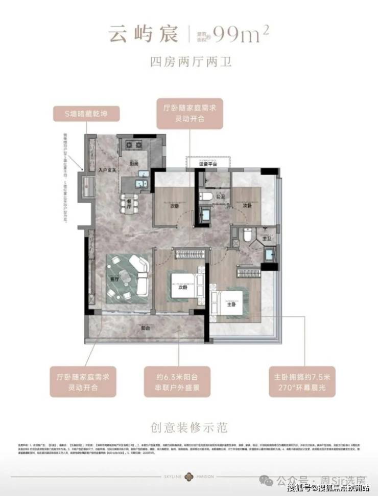99㎡的4房2厅2卫,设计的是竖厅格局,客厅3.35米开间,LDKB一体化,S墙设计预留双开门冰箱卡槽位,三开间朝南,动静分区,U型厨房,公卫三段式干湿分离,赠送设备平台,得房率约78.27%(不含赠送),客厅连接次卧出9.37m²大阳台西南或东南朝向。靓点:99平做到了4房2卫,主卧270°无柱转角飘窗,厨房烟道外置+额外赠送设备平台,并且是纯南向格局。