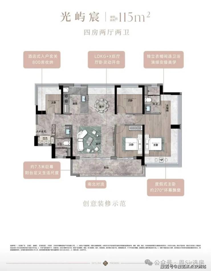 115㎡的4房2厅2卫,设计的是竖厅南北通透格局,进门入户玄关,客厅4.45米开间,餐客厅分离设计,客厅连接次卧出10.87m²的观景大阳台,L型中式+岛台灵动式厨房,公卫三段式干湿分离,得房率约78.27%(不含赠送),阳台主朝东南或西南向。靓点:南北对流+7.25米长超大观景南向阳台,超大主卧+270°无柱转角飘窗。