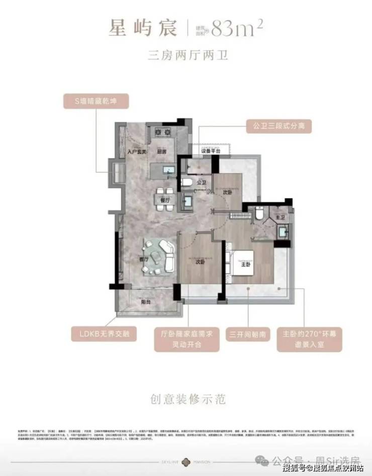83㎡的3房2厅2卫,设计的是经典竖厅格局,客厅3.35米开间,LDKB一体化,S墙设计预留双开门冰箱卡槽位,三开间朝南,动静分区,U型厨房,公卫三段式干湿分离,赠送1.98平设备平台,得房率约77.15%(不含赠送),阳台5.02m²西南或东南朝向。靓点:83平做到了3房2卫,主卧270°无柱转角飘窗,厨房烟道外置+额外赠送设备平台,并且是纯南向格局。