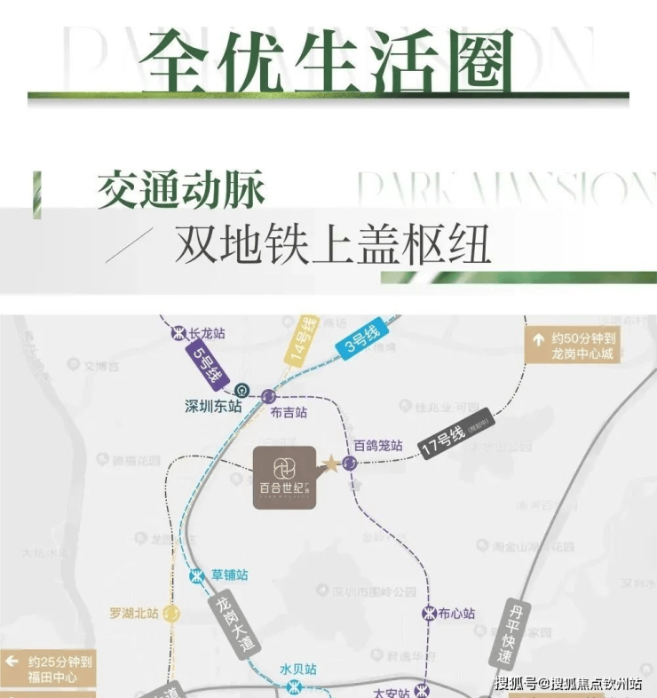 项目于5/17号线(建设中)百鸽笼站双地铁上盖,3/14号线环绕,1站瞬达罗湖,4站抵达福田芯。