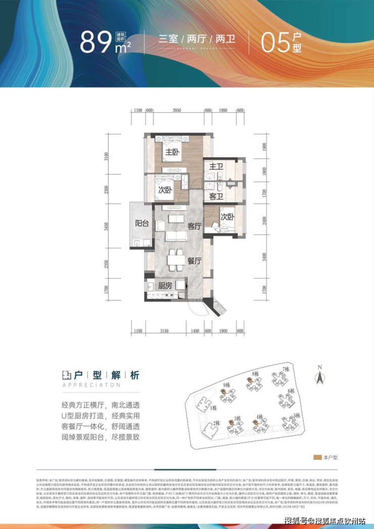 建面约89㎡ 3房2厅2卫(竖厅):南北通透3房,全凸窗设计,动静分区合理