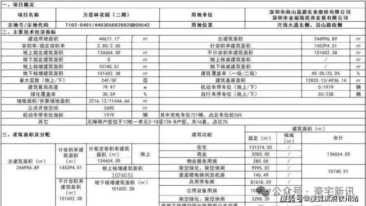 万星林花园项目位于前海合作区南山街道兴海大道东侧,沿山路南侧,宗地号T102-0401。根据本项目《深圳市国有建设用地使用权出让合同》及《建设用地规划许可证》,项目总用地面积53819.80平方米,用地性质为二类居住用地;计规定总建筑面积139654平方米,其中住宅131374平方米、商业3000平方米、幼儿园5000平方米(独立占地面积5400平方米,18班)、物业管理用房280平方米;规定容积率≤2.6;建筑一级覆盖率≤40%,二级覆盖率≤25%;建筑高度限高80米;机动车泊位数1979辆;地块内需提供不少于2690平方米公共开放空间。