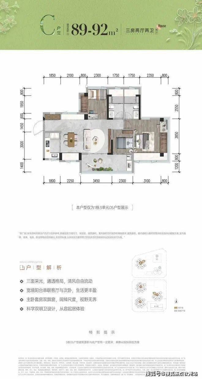 宝安沙井【招商会展湾雍境名邸】本次首推1栋3单元,共198套房源,面积有78-80㎡的3房1卫,89-92㎡的3房2卫户型。