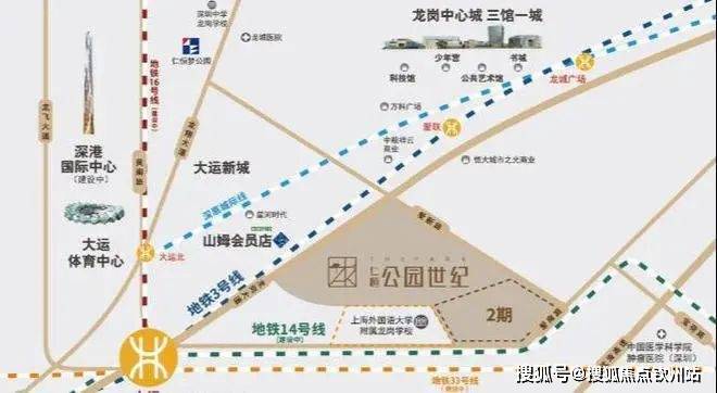 【大运枢纽站】规划4轨与此交汇。3-14-16号线(已开通)33号线(建设中中6站直达机场),乘坐14号线可8站至福田,实现龙岗与福田快速通达。