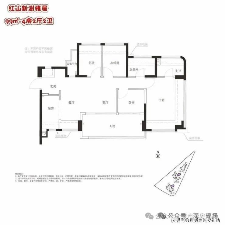 99㎡的4房2厅2卫,设计的是横厅南北通透格局,客餐厅5.35米开间,LDKG+X空间一体化,进门独立入户玄关,五开间朝南,主卧大套间设计,餐厅位带1个设备平台,U型厨房,卫生间干湿分离,得房率:100%(包含赠送),阳台东南朝向。
