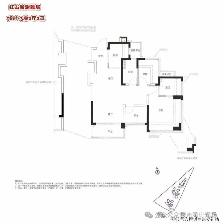 78㎡的3房2厅2卫,设计的是竖厅格局,客厅3.4米开间,LDKG+X空间一体化,S墙设计预留冰箱卡槽位,动静分区,三开间朝南,主卧+1个次卧都是双飘窗设计,次卧带1个设备平台放空调机位,U型厨房,卫生间干湿分离,公卫带1个设备平台可日常使用,得房率:100%(包含赠送),西南或东南朝向。