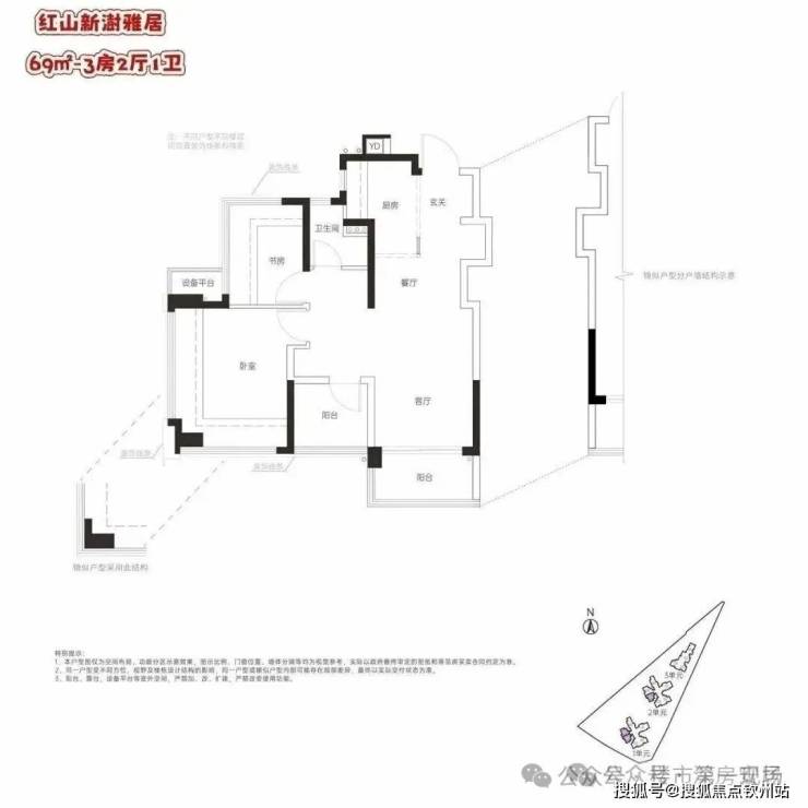 69㎡的3房2厅1卫,设计的是竖厅格局,客厅3米开间,LDKG+X空间一体化,S墙设计预留冰箱卡槽位,动静分区,三开间朝南,主卧+1个次卧都是双飘窗设计,次卧带1个设备平台放空调机位,U型厨房,卫生间三段式干湿分离,得房率:100%(包含赠送),西南朝向。