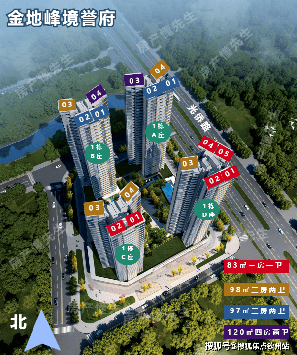 金地峰境誉府,由金地集团打造,总占地面积约1.5万㎡,总建筑面积约7.93万㎡,计容建筑面积约5.4万㎡,容积率3.5,绿化率40%,共由4栋30-32层住宅组成,其中1栋A/B/C座商品房32F,1栋D座商品房30F。