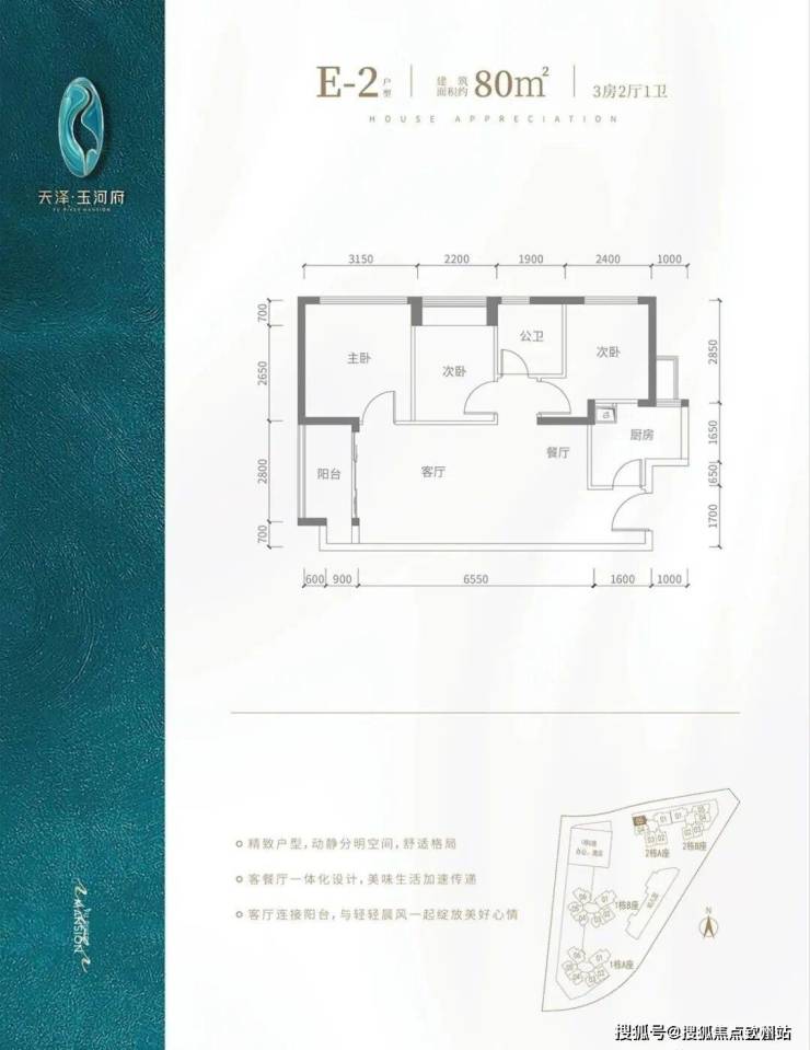 E2户型-80㎡-3房2厅1卫,设计的是竖厅格局,客厅3.5米开间,餐客厅一体化,阳台2.8米长,朝西向。