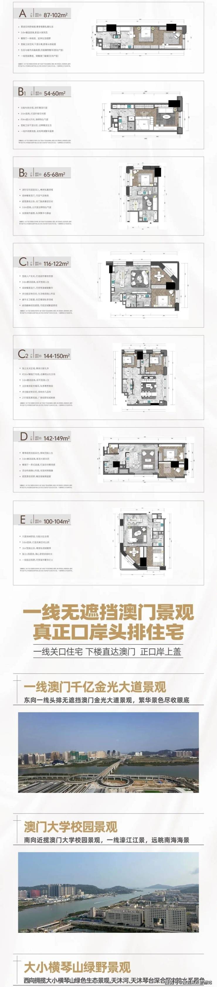 【项目卖点】1.横琴一线关口之上住宅,下楼即是澳门。2.横琴唯一在售一手小面积住宅。3.首付48万起买横琴口岸住宅 看山看海看澳门,年租金50000+。4.稀缺小面积住宅金融属性多样化,变现快,流动性强。。5.千亿国企大品牌买的放心住的安心。6.横琴交通枢纽核心地段