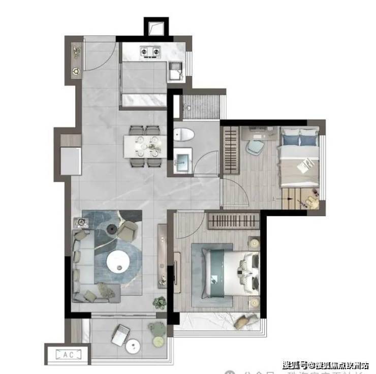 67㎡丨两房两厅一卫:客厅带南向大阳台;主次卧均赠送大飘窗