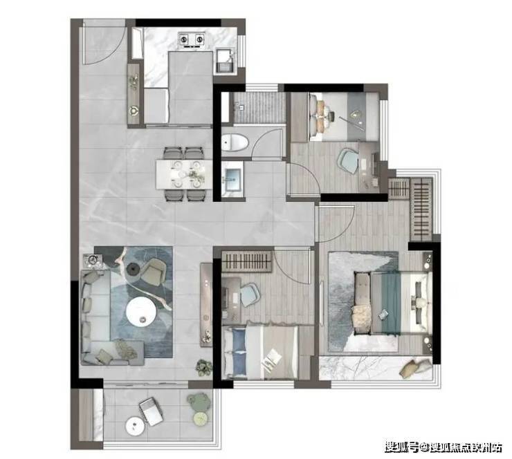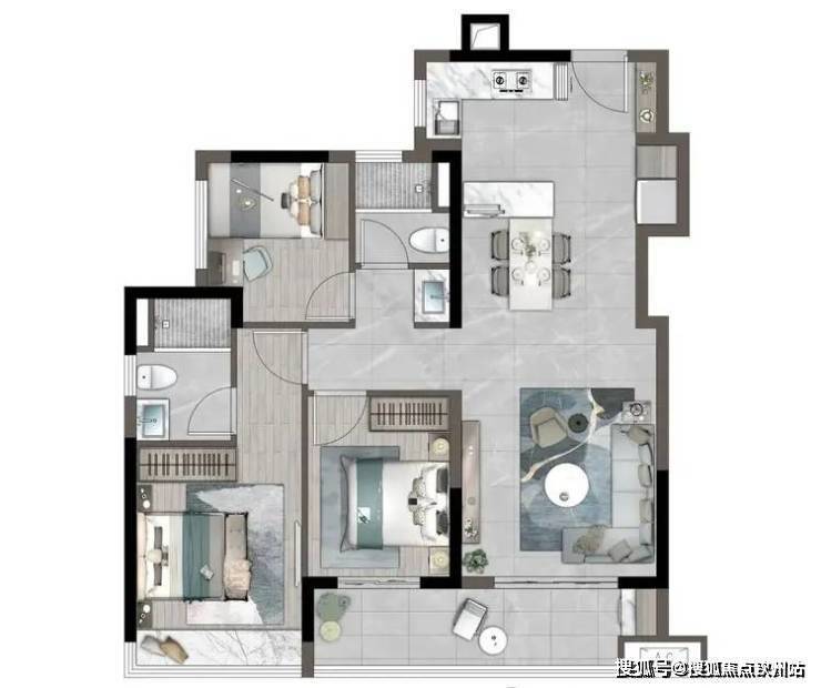 89㎡丨三房两厅两卫;LDKG一体化设计;U型厨房;约6米双面宽超大景观阳台;独立卧室带独立卫浴;主题设计儿童房