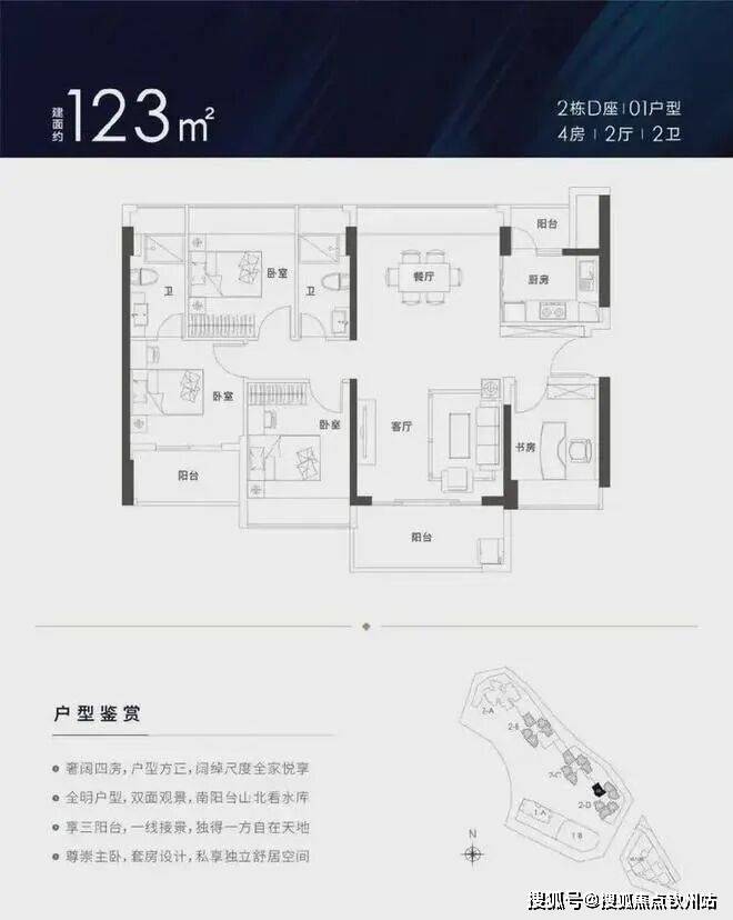 123㎡的4房2厅2卫,设计的竖厅南北通透格局,客厅主卧双阳台设计,厨房也带小阳台,客厅朝西南向,高层可享受双面景观。