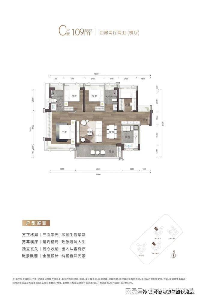 建面约109㎡四房两厅两卫:横厅设计,实用率约98%,相较108平竖厅户型有了不少的升级,玄关处转角设计的隐私性得到提升,客餐厅6米开间,主朝西南向的阳台同样宽长6米,主卫还有三段式干湿分离设计