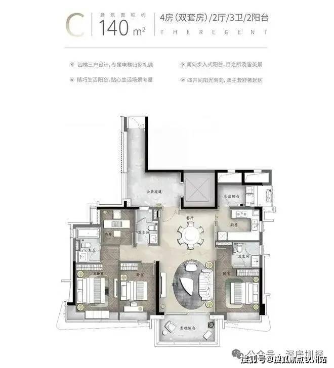 产品亮点:私家电梯入户、部分楼层三面采光、约3.4米层高、U型阳台360°观景、约6.8米挑空餐客厅、中西双厨、三套房设计、部分房间带阳台设计