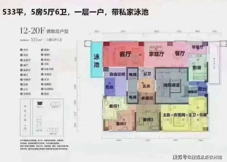 特色户型:建面约530-540㎡的顶层复式,拥有私家泳池和空中花园