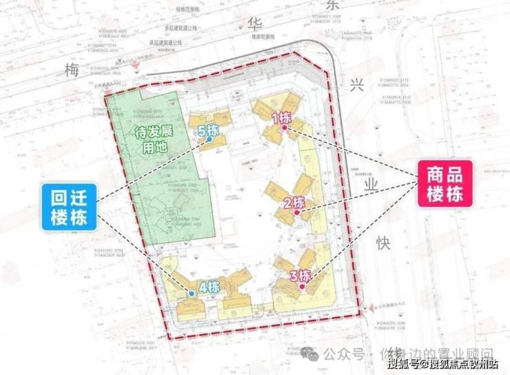 其中,东面的1、2、3栋为商品房楼栋,西面的4、5栋为回迁楼栋。