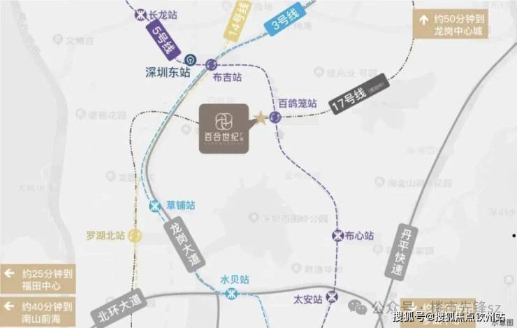 百合世纪广场紧邻地铁5号线百鸽笼站(步行约100米),且未来规划有17号线罗岗站约450米在此交汇,形成双地铁上盖优势,通过地铁5号线,1站可换乘3/14号线,4站直达福田核心区,7站快速通达深圳北站,高效串联南山、前海等区域。