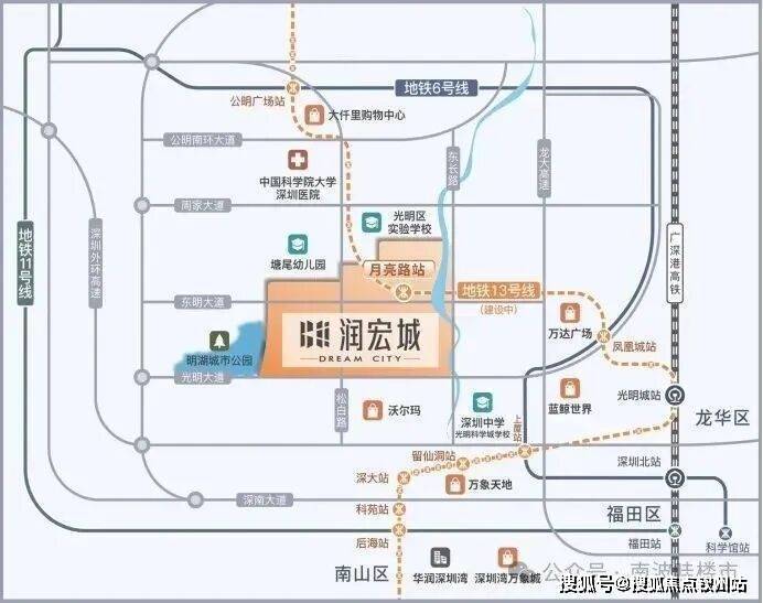华润润宏城位于光明区凤凰街道塘尾社区,光明大道和东长路交汇处的西北侧,刚好在13号线“月亮路站”附近,北部接壤东周路。