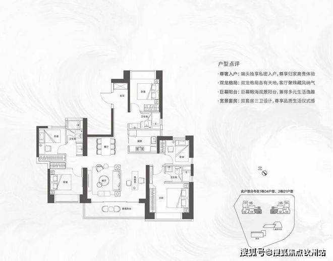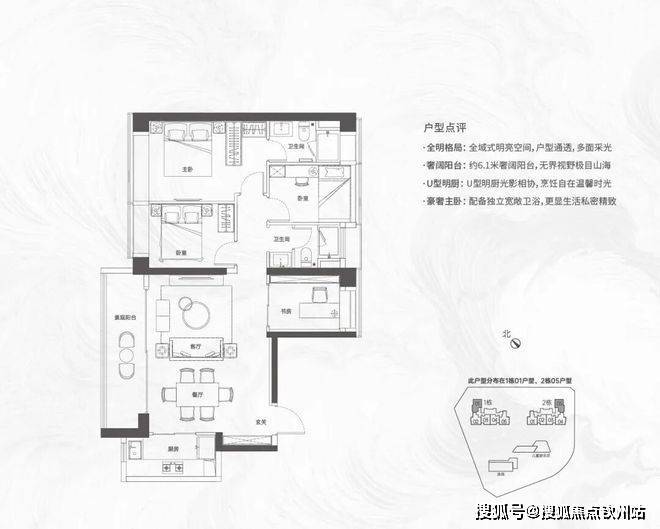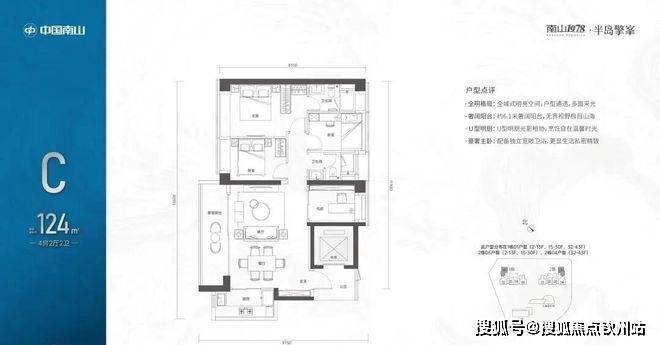 【124㎡的4房2厅2卫】1栋01/2栋05户型,电梯入户送独立公区,横厅南北通透格局,客餐厅6.1米开间,五开间朝南,主卧大套间设计,6.1米长观景大阳台,U型厨房,得房率:72.07%(不含赠送)西北或东南朝向;