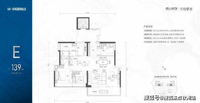 【139㎡的4房2厅2卫】1栋03/2栋02高区户型,电梯入户送独立公区,竖厅类双龙抱珠格局,四开间朝南,主卧大套间设计,有1个多功能间可以做书房,6.4米长观景大阳台,L型厨房带1个生活阳台,卫生间干湿分离,得房率:72.07%(不含赠送),西南朝向;