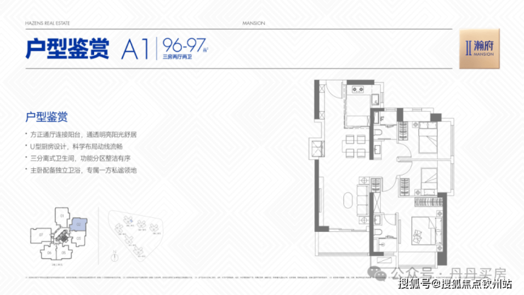 96-98㎡三房两厅两卫:折后总价350万-401万。作为入门级改善产品,该户型以紧凑方正格局、U型厨房及双卫配置,适配年轻家庭或首改客群的预算与功能需求;