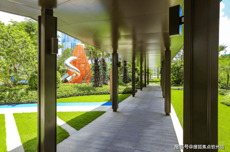 除此之外,小区入口处就是超30米迎宾水景,搭配阵列式加拿利海枣,更有仪式感;超800㎡阳光大草坪,融合居住空间与自然的和谐统一;风雨连廊则连接每栋入户大堂,从门口到家楼下无缝接驳,方便雨天出入。