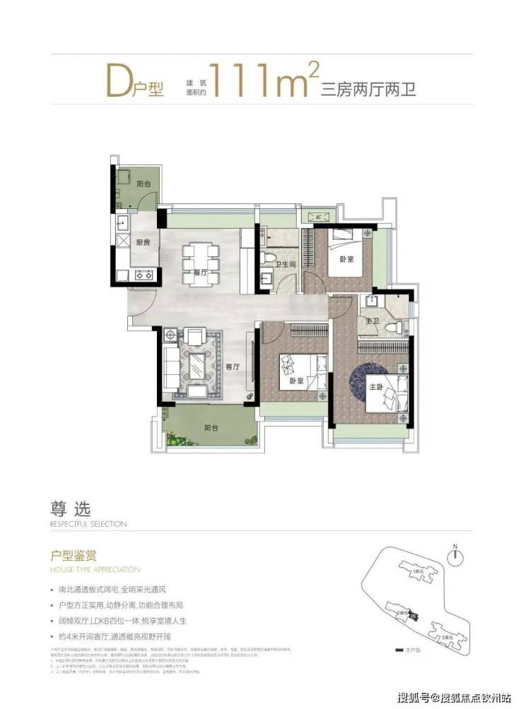 111㎡的3房2厅2卫,仅1栋2单元D户型,设计的是竖厅南北通透格局,板楼设计,客厅4米开间,LDKB一体化设计,三开间朝南,3个卧室分别做到了主卧13.88㎡/次卧11.1㎡/次卧9.99㎡(包含墙体飘窗),L型厨房还带1个小生活阳台,卫生间干湿分离,得房率约78.83%(不含赠送),西南朝向。