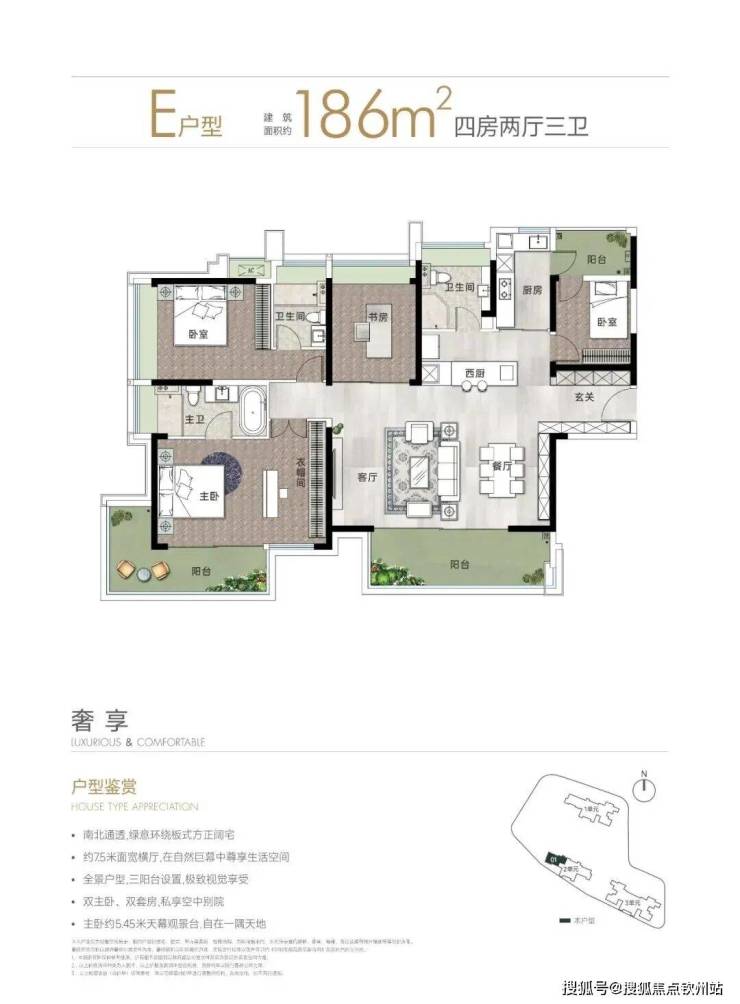 186㎡的4房2厅3卫,仅1栋2单元E户型,设计的是横厅双阳台格局,板楼设计,进门入户玄关,客餐厅7.5米开间,LDKB一体化设计,三开间朝南,双套房设计,4个卧室分别做到了主卧23.65㎡/次卧17.55㎡/次卧12㎡/次卧8.1㎡(包含墙体飘窗),中西厨房设计,卫生间干湿分离,得房率约78.83%(不含赠送),西南朝向。