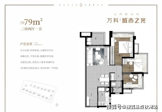 户型:在售建面约 79-119㎡三至四房,主力户型为 79㎡2+1 房 2 厅 1 卫、89㎡2+1 房 2 厅 2 卫、105㎡3+1 房 2 厅 2 卫、119㎡4 房 2 厅 2 卫,均为精装交付,空间利用率高。