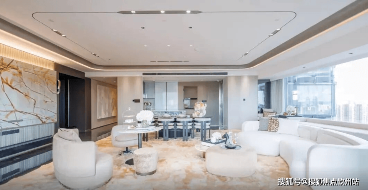 大平层约3.25米的层高,在顶豪圈里都是很罕见的高阔配置。每一户都有一个双面观景采光的一体化餐客厅。环幕视野引入室外景观,成为少数人才能拥有的风光背景墙。